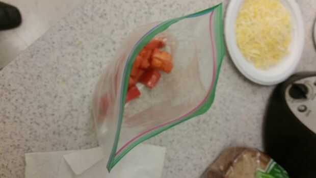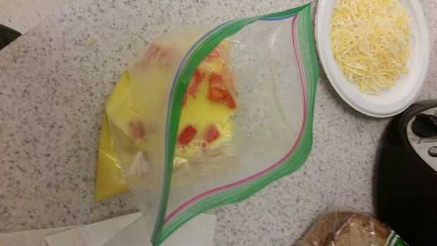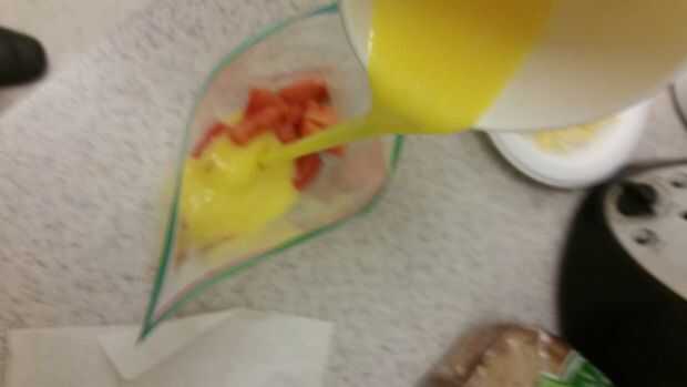Entonces sólo vierte los huevos mezclados en la bolsa de tomates en cubitos y mueva la bolsa alrededor de un batido o dos.