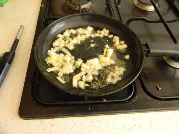 5. calentar un botón de mantequilla o margarina en la sartén y freír las cebollas hasta que ablanden.