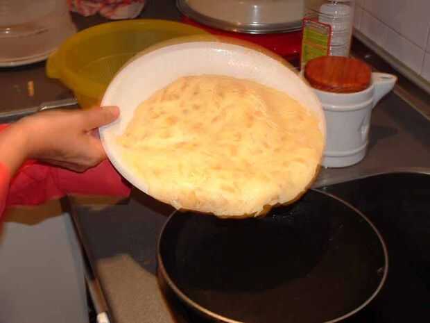 Deje cocinar durante un minuto o así, hasta que veas que es ser consistente. Girar la tortilla como se ve en la foto y freír el otro lado por un minuto.