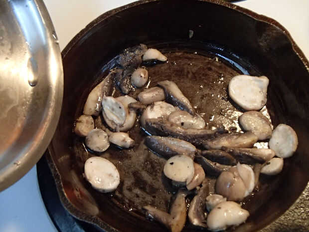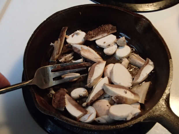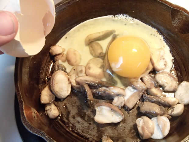 Una vez que las setas se realizan (es decir, cambiaron color y textura), entonces grieta en un huevo o dos, tal vez con algunos pimienta gruesa molida. Ajo (y una cebolla) ciertamente no vendría mal, si lo tiene. (Además, esto podría ser un buen momento para usar las yemas de cuando hicieron algunos de mis Pavlovas Personal.)