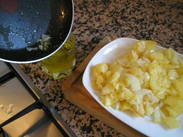 Ahora retire patatas y cebolla de la sartén, separar el aceite de oliva.