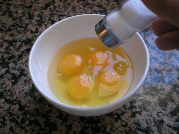 Mientras se fríen las patatas y la cebolla, bate los huevos en el bol, con una pizca de sal.