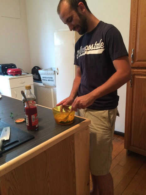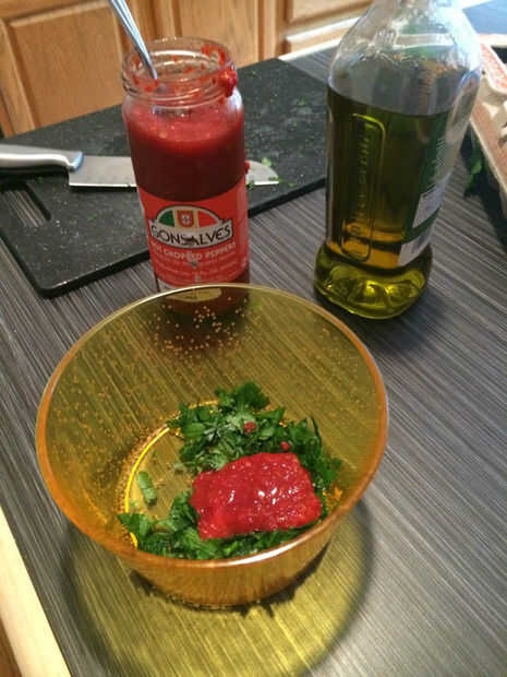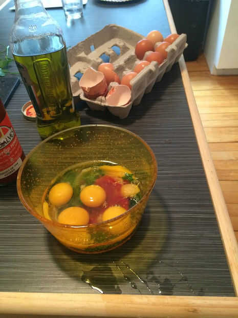 Añadir perejil a su recipiente, así como una buena cucharada de pimiento rojo picado. Ahora crack 4 huevos en el bol (o en mi caso 4.5 porque la mitad de un huevo aterrizó en el piso mientras trataba de showboat). Ahora seguir adelante y batir todo.