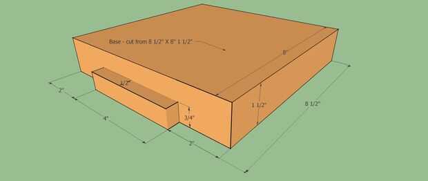Use una sierra de mesa y patín para cortar la madera del extremo del "extremo de grano", como se muestra a las dimensiones indicadas. Terminarás con una 8 "X 8" pieza con una 1/2 "x 3/4" saliente en la parte delantera. (Esto se acoplará con la parte de fulcro más adelante)