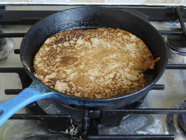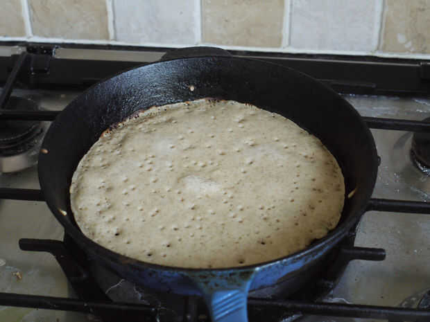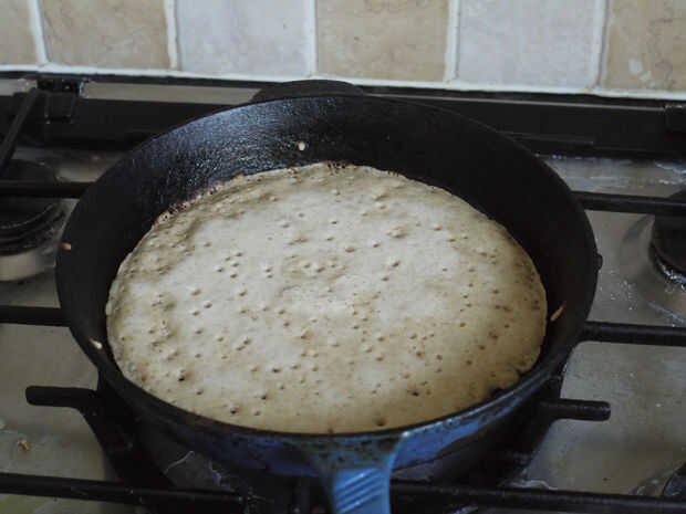 Tan pronto como se establece arriba, voltear el oatcake para hacer el otro lado. Debe tomar un minuto o dos. En estas fotos, la primera no está todavía listo, la segunda es la correcta. La diferencia entre los dos fue de unos 20 segundos, así que Mantén tus ojos en él.
