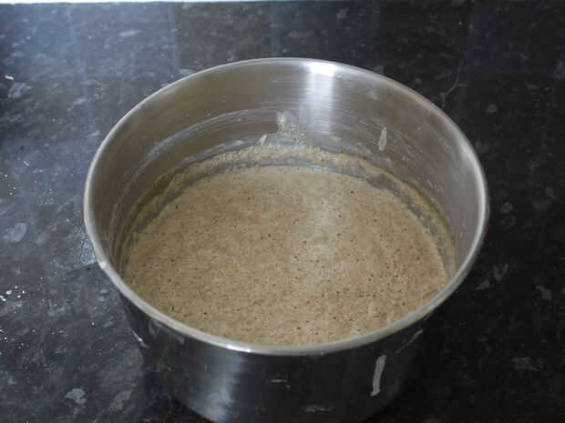 Cuando fermenta, verifique la consistencia de la masa. Debe ser agradable y espumoso pero probablemente será más gruesa que cuando se mezcla, debido a los ingredientes secos se absorbe parte del líquido. Sólo agregar tanto más líquido usted necesita y venció a algún tumor. Para este lote Añadir toda la leche que había sostenido detrás y era justo. No batir demasiado sin embargo, desea conservar las burbujas. Usted debe terminar con una masa suave, gruesa, pero aún colable.
