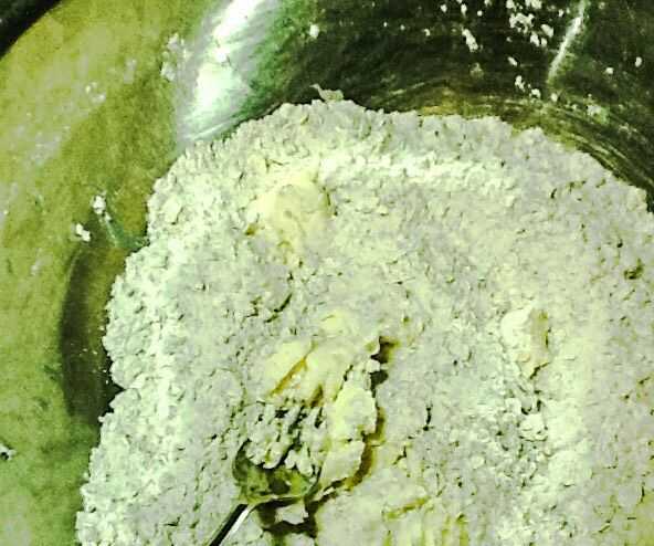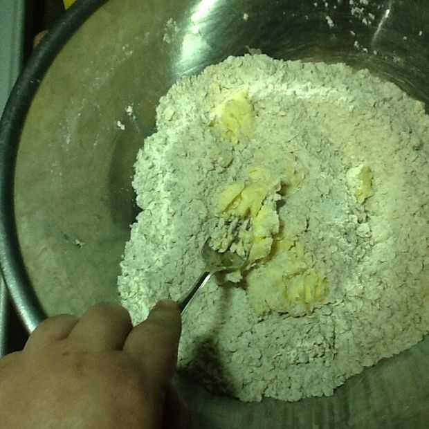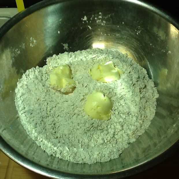 Añadir 3 cucharadas de mantequilla un poco blanda y corta con un mezclador de repostería o tenedor o frotar con los dedos, hasta que la mezcla se parece a las migas de pan fino. (Algunos grumos pequeños están bien. Lamentablemente, yo no parecen haber tomado una foto de lo que parece cuando completamente mezclado.)