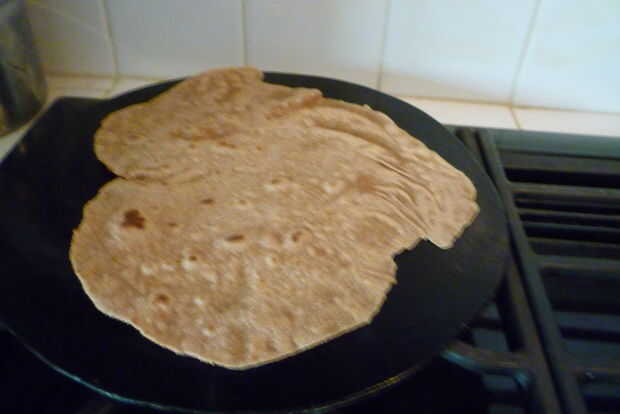 Calentar la tortilla durante unos 20 segundos en cada lado, los bancos sólo una vez.