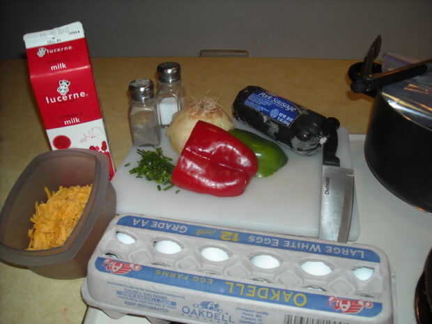 Para mis tortillas usé: pimiento rojo, pimiento verde, cebolla, salchicha (cocinado), queso y ciboulette