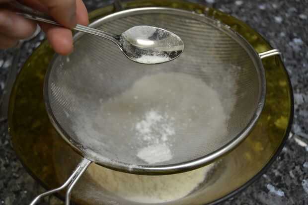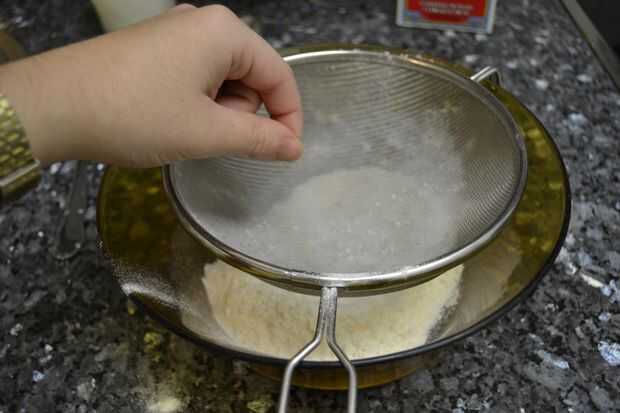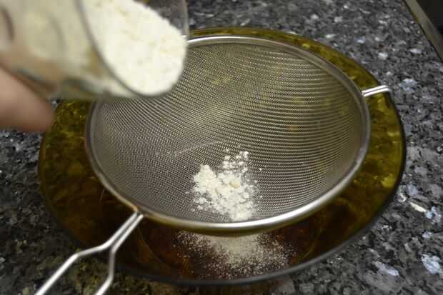 Coge uno de los tazones de fuente y el tamiz y uno a uno, añadir los ingredientes. El tamiz hará la mezcla más suave.