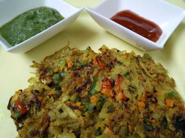 Rallar las papas y agregue todos los ingredientes excepto el aceite y las verduras. Mis juntos y hacer una pasta. En una cacerola antiadherente, difundir las tortitas de patata laccha y cocinar como otros crepes hasta que se pone crujiente de un lado. Aplicar las verduras picadas en la capa superior y voltear la tortilla. Cocinar con poco aceite como se pone crujiente. Servir caliente con chutney de tomate verde y salsa de tomate.