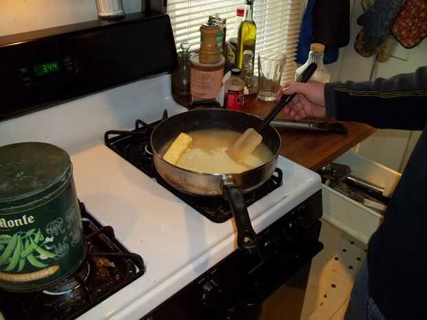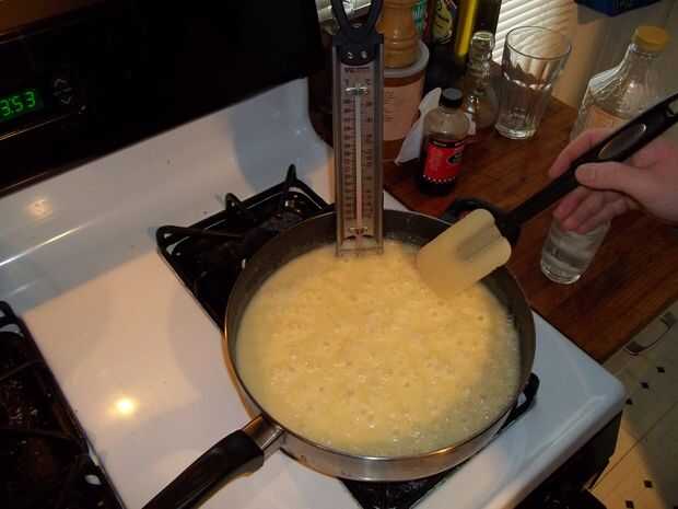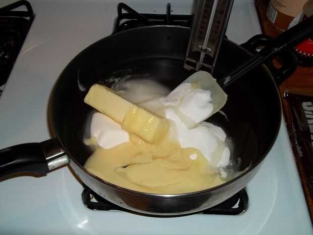 Hacer el caramelo mezcla todos los ingredientes (excepto la vainilla) en una salsa de 6 cuartos pan y cocción en cadena calor medio constantemente. Cuando llegue a hervir añadirle termómetro de caramelo y cocinar hasta que llegue a 220 grados Fahrenheit una vez 220 agregar la vainilla y revuelve pulg es importante revolver constantemente este si deja lo comenzará a grabar en la parte inferior. También tenga cuidado azúcar hirviendo es muy caliente y puede quemar gravemente si es derramado o salpicado en usted.