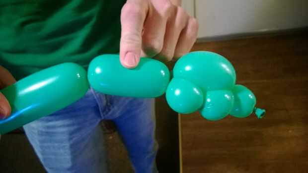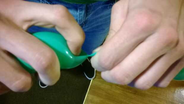 5. deshacerse del pellizco de globo restante sobre una pulgada y media de las tortugas de nuevo a cerca de tres veces la torcedura. Al pellizcar el giro con una mano, tiene el empuje en el globo restante a pop. Ahora deje que el aire fuera de la última sección y atar apagado. Empuje entre el caparazón y las patas y listo.