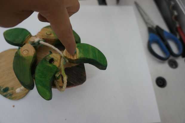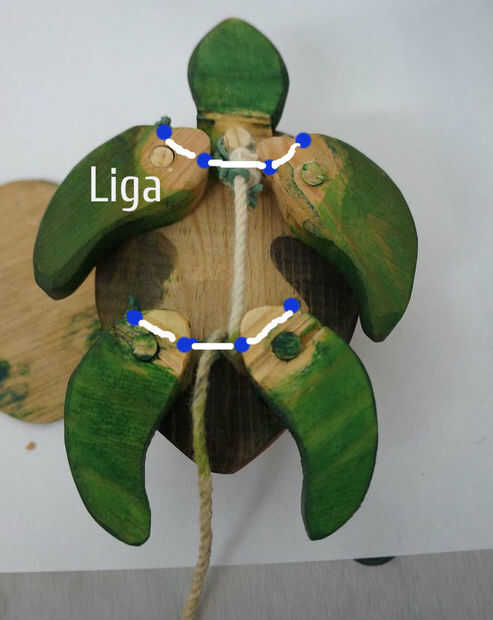 De esta forma, realizaremos un nudo con la cuerda de algodón, en el centro de la liga de las aletas superiores, colocaremos la cabeza y las aletas en su lugar y con la misma cuerda, realizaremos otro nudo en el centro de la liga de las aletas inferiores, como se muestra en la imagen 3. El resto de la cuerda lo dejaremos colgando.