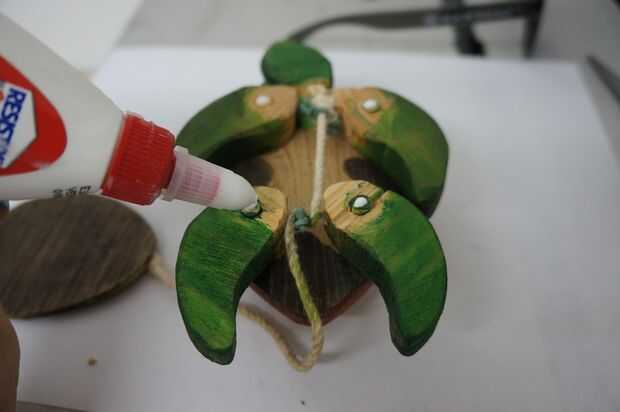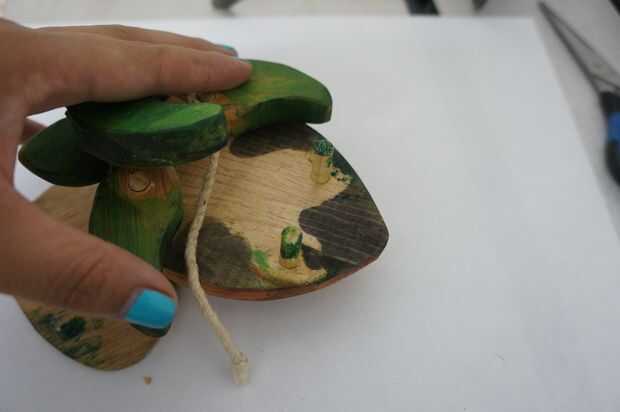 Finalmente colocar un poco de pegamento en los palos de madera y poste el vientre de la tortuga.