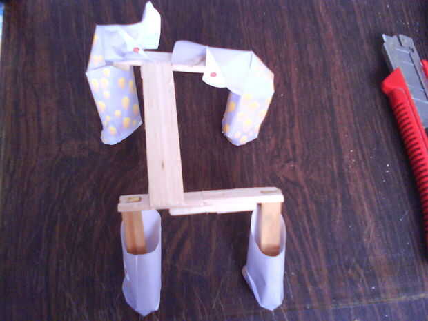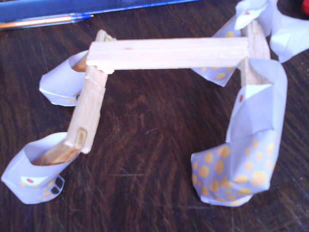Desmontar las pinzas de ropa y reservar uno de los muelles. El mapache de la madera son los "huesos" de las piernas. Utilicé un trozo de tablero de la espuma para poner en los pies y pegado con pegamento caliente, la madera en ellos. Utilizando el número de parte 8 ("vientre"), midió la distancia que sería una de la otra pierna y pegado un pedazo de madera que conectan. Luego Mida la distancia entre la parte delantera y patas traseras, corte y había pegado de la madera base, uniendo todos los fours, formando la base.