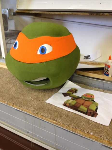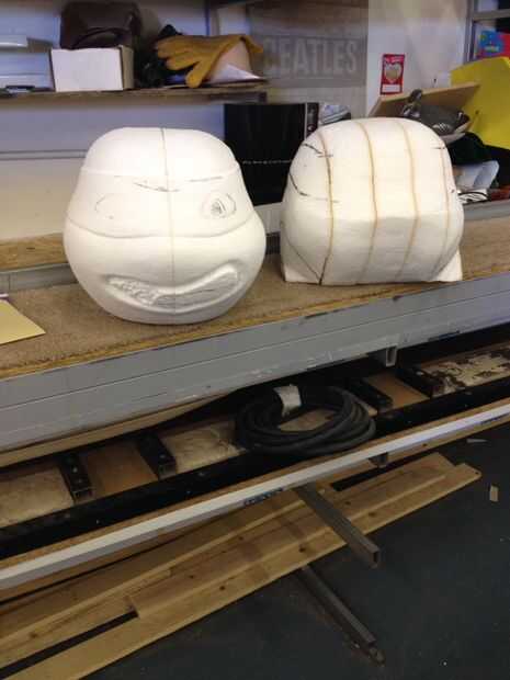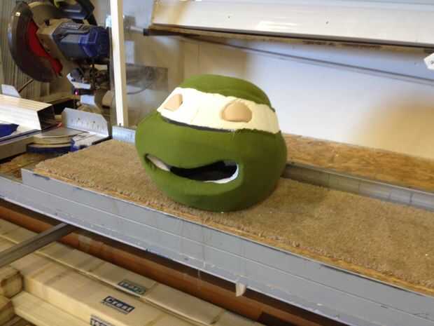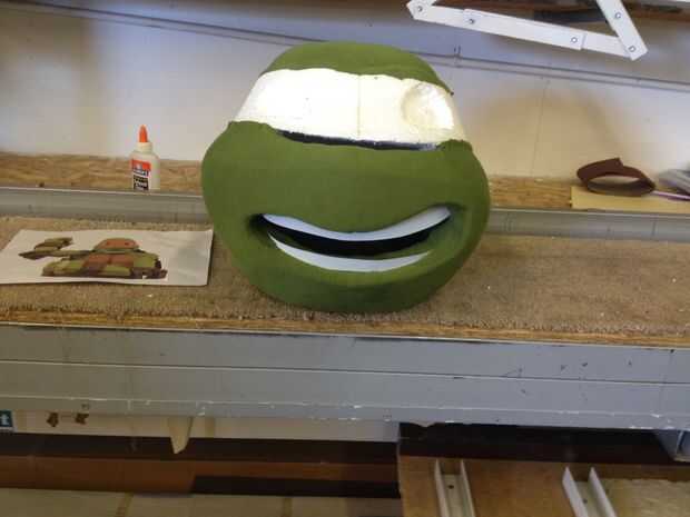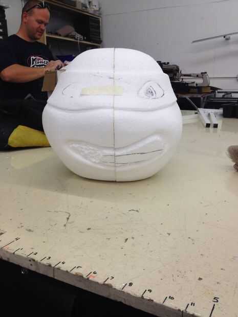 Paso uno: teníamos 6" bloques de la espuma que pega (homedepot vende 2" usted puede unir) para obtener el tamaño adecuado. Elaboramos una plantilla del frente y del lado de la cabeza. Y también la cabeza para asegurarse de que no hacer una tortuga la cabeza demasiado grande o pequeño. Puede utilizar una amoladora con un disco de lija y una hoja de sierra para cortar la espuma de poliestireno que no necesita pero usted debe usar una gafas de seguridad y mascarilla. La espuma va a todas partes. Después de cortar su forma áspera se luego lijar a mano para obtener su forma exacta. Cuando su feliz que puede empezar a destripar el interior como su talla una calabaza a la forma exacta de su cabeza puede caber en. Cortamos la boca para ver y también cortar una abertura justo debajo de la bandana para ver que ayuda inmensamente. Cubrir la cabeza con adhesivo en aerosol y cualquier material elástico de su elegido.