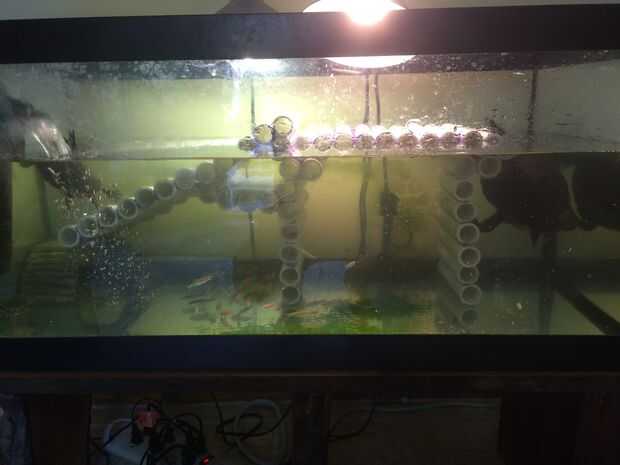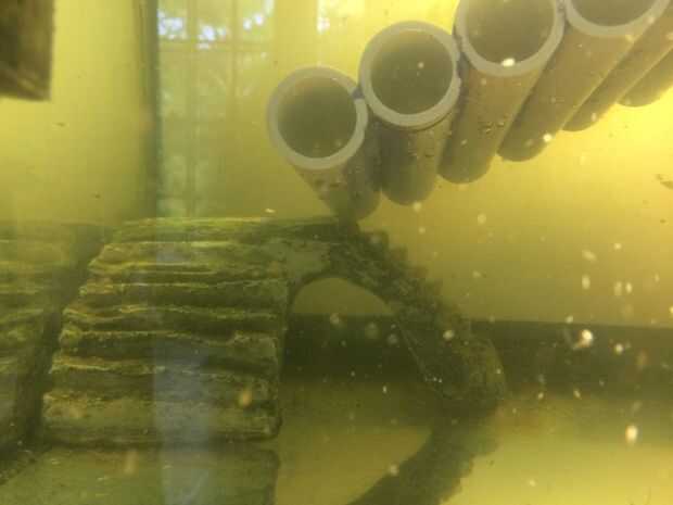 En la 2ª foto , verá que la rampa no es tiempo suficiente para llegar a la parte inferior del tanque. Terminé usando una rampa de acuario de la tienda para sujetar la rampa pvc sólidamente en su lugar.