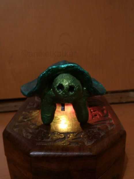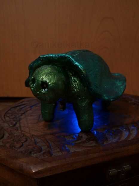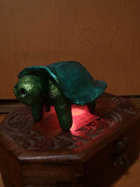 Aquí he hecho una tortuga de mascota con la ayuda de la arcilla y le añadió algunos electrónica. La electrónica incluye un efecto luz de neón tipo por debajo de la tortuga. También incluye un interruptor sensible del tacto que al tocar las tortugas de nuevo, el LED en los ojos del resplandor.