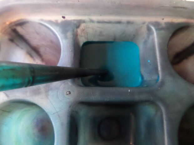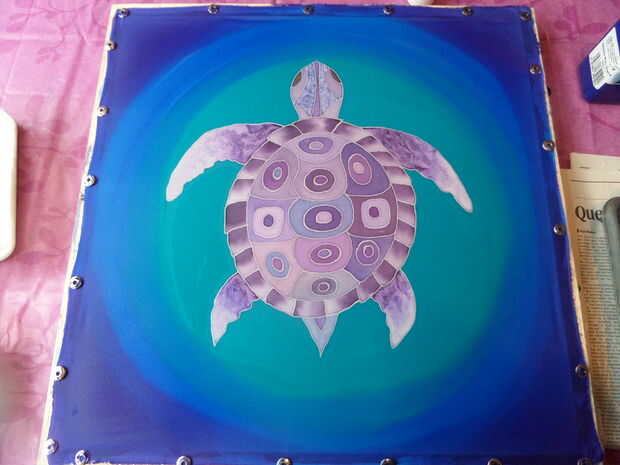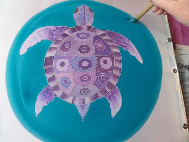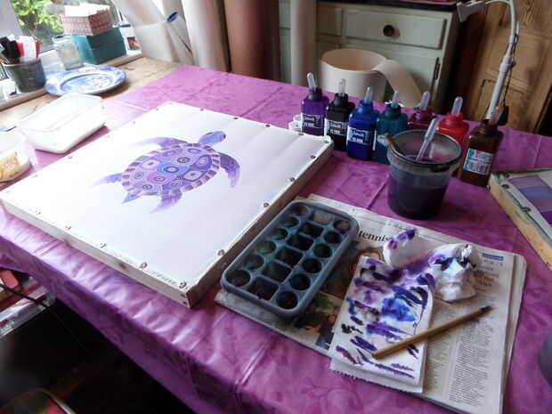 He añadido agua a la pintura turquesa y trabajado hacia fuera de la tortuga, superposición de gitane azul e iris violeta hasta que el blanco estaba cubierto.