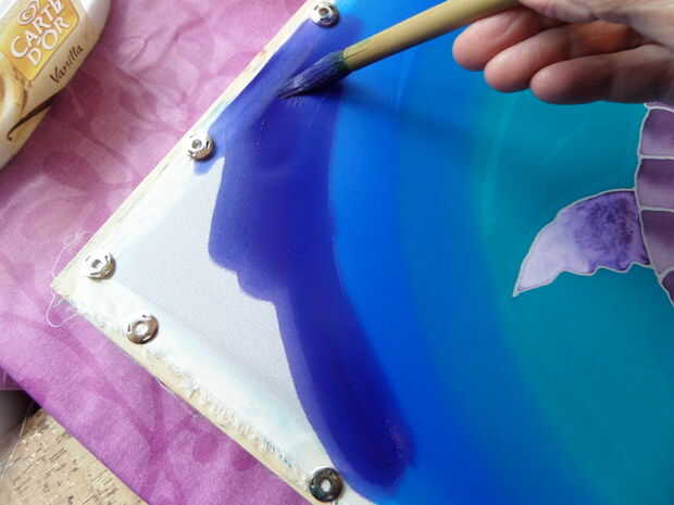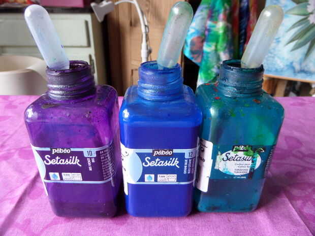 Estoy usando gitane azul, turquesa y violeta, iris pintado directamente sobre la tela seca, pero trabajan bastante rápido con un pincel más grande.
