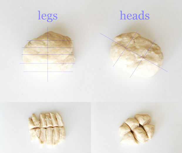 4. Para hacer las patas, corte cada uno de los 2 pedazos de masa en 12 pedazos pequeños como en la foto; 5 se atraviesa y se cortan por la mitad.