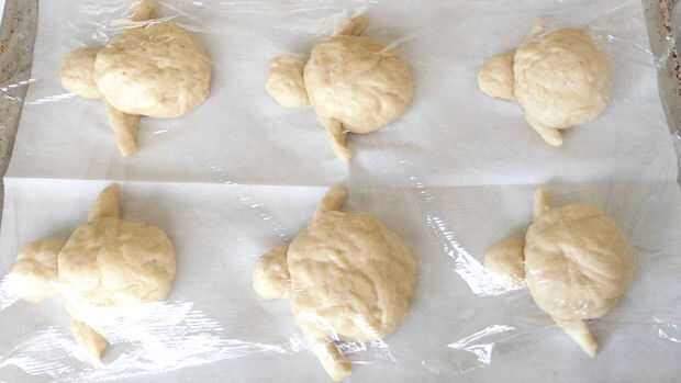 6. Distribuir los órganos en una placa para horno. No poner más de 6 tortugas en una hoja y dejar unas pocas pulgadas de espacio entre cada tortuga. Si les pones demasiado cada otros terminarás con un ciempiés de tortuga espeluznante.