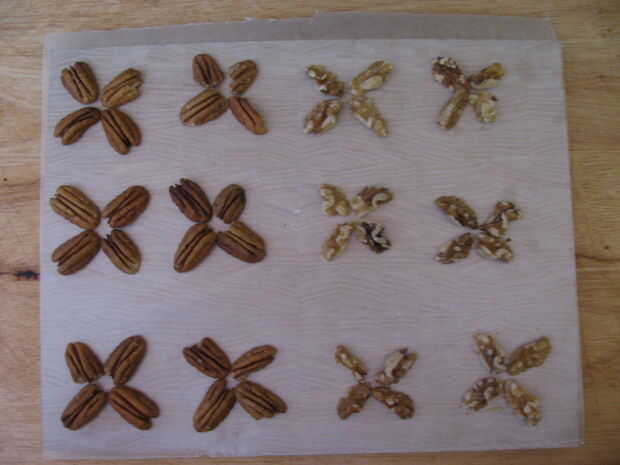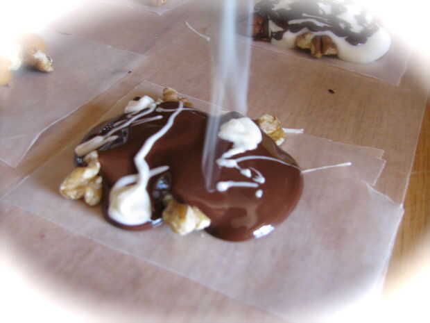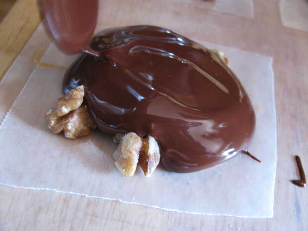 5 usando una cucharada vierta corteza capa más la mitad de los racimos de la tuerca y caramelo. Extienda suavemente. Debe cubrirse el caramelo pero se deben exponer las tuercas en los extremos.