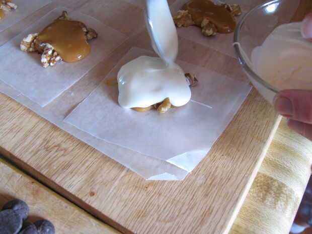 2 derretir los caramelos a fuego lento en la estufa (o microondas según las instrucciones del paquete). Agregar la crema y revuelva bien. Dejar que enfríe un poco (si está demasiado caliente la voluntad caramelo extendido demasiado) y utilizar la cuchara para colocar una cucharada grande en el centro de los racimos de la tuerca. Una segunda capa añadir altura a tus tortugas.