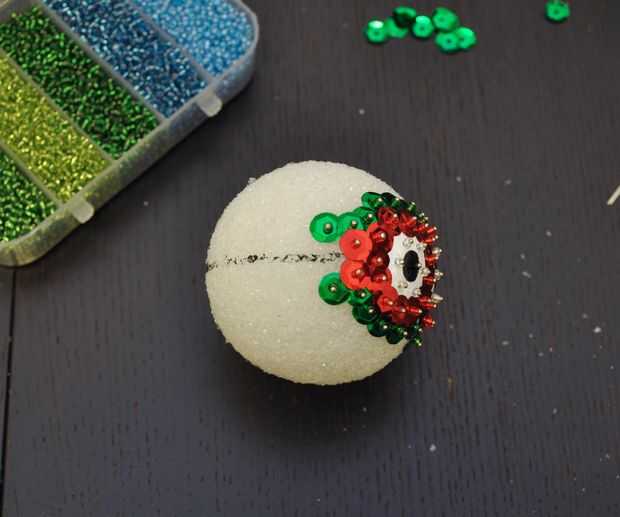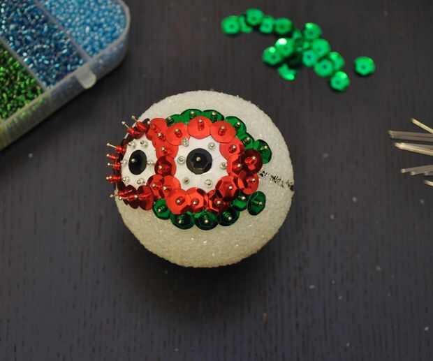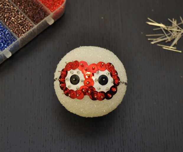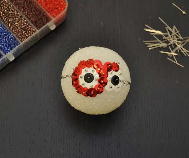 En los bordes de los ojos, quiere dejar un espacio para una máscara alto dos lentejuelas que irá alrededor de la bola (se puede ver en las dos últimas imágenes).