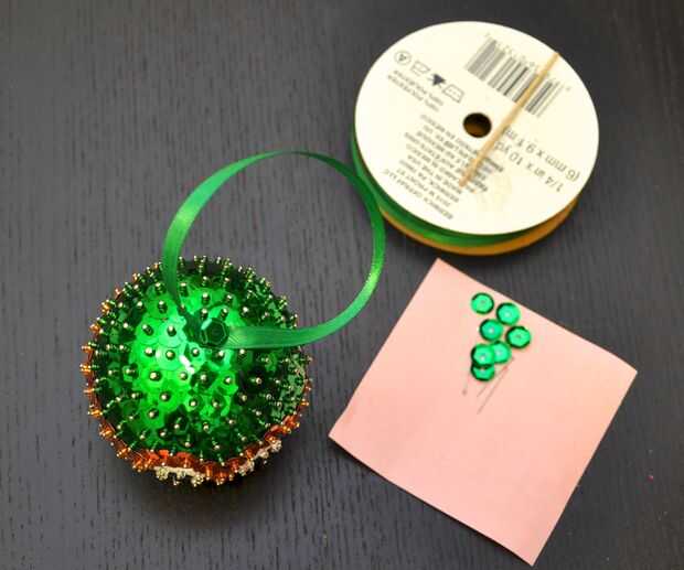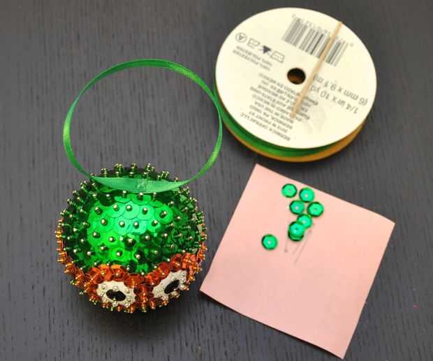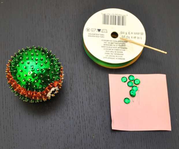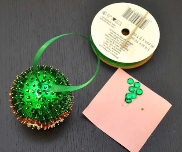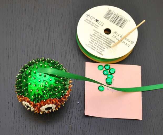 - Tomar un alfiler con una perla y palillo a través de las lentejuelas y asegúrese de que también pasa a través de ambos extremos de la cinta.
