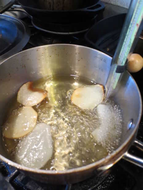 Trabajar en lotes pequeños, freír sus papas hasta que estén doradas y con una cuchara de malla, la transferencia a una hoja para hornear forrado de toalla de papel. por lo que la toalla absorbe el exceso de aceite.