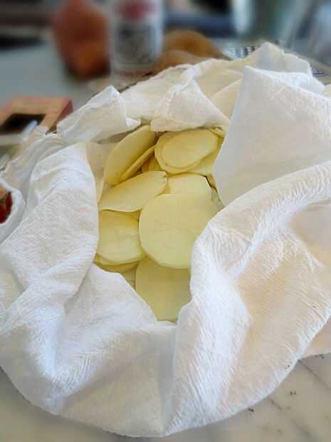 Usando una toalla de cocina, secar las patatas y en posición plana sobre una toalla seca para preparar para la fritura.