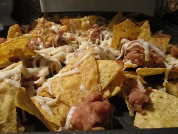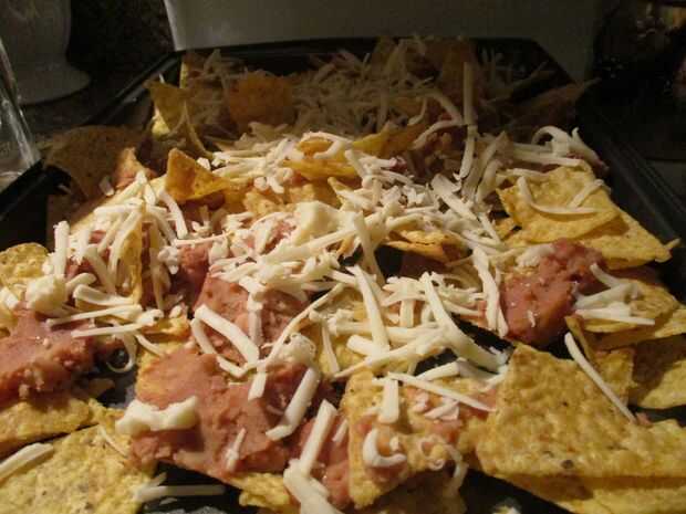 Para la cocción parte de tostada chips todo lo que necesitas hacer es precalentar el horno a 350 grados Fahrenheit. Entonces, mientras el horno está precalentando propagación las virutas de maíz hacia fuera en una bandeja uniformemente, uniformemente repartidas las habas de las virutas de maíz y espolvoree el queso (rallado) todo la bandeja entera.