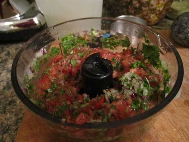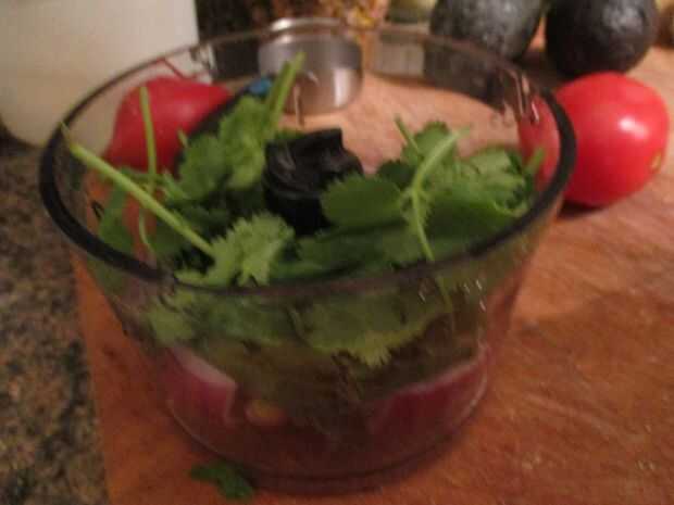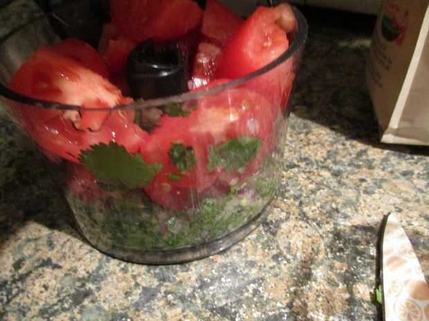 Para hacer la salsa, comenzar a licuar el cilantro y la cebolla en un procesador de alimentos. Luego, añadir el el tomate y mezcla hasta que tenga una consistencia de salsa chunky. Una vez hecho esto, agregar un poco de sal al gusto y si desea, añadir un poco de jugo de limón.