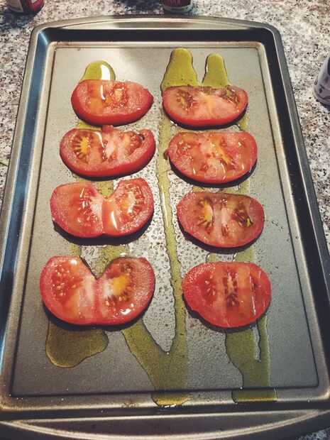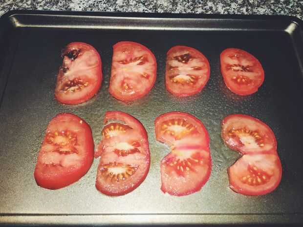 7. Coloque la bandeja para hornear en el horno para dejar que los tomates asados. Tardará unos 15 minutos.