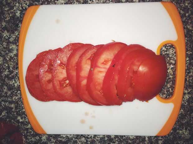 Corte la longitud de tomate sabia alrededor de un cuarto de pulgada de grosor, para que al asar mantendrá su estructura y de una pieza completa es suficiente para cubrir una pieza completa de pan tostado. Cómo se hace es totalmente preferencia.