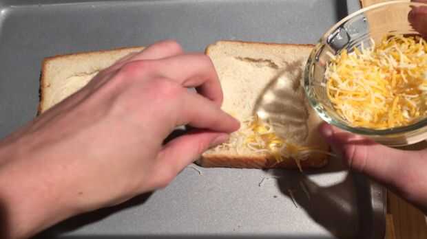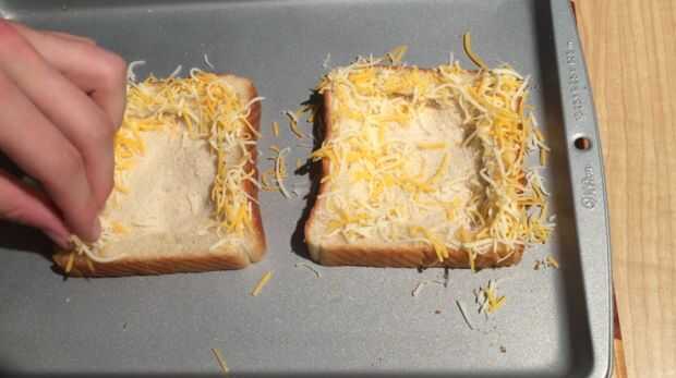 Espolvorear el borde engrasado del pan con queso. Trate de ser cuidadoso y no queso en la bandeja para hornear, porque definitivamente se quemará.