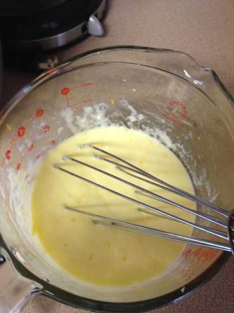 En una medida de 2 taza batir el suero de leche, huevos, crema agria, mantequilla, aceite de naranja y ralladura de naranja. Añadir todo a la vez para la mezcla de harina. Suavemente revuelva hasta que se humedezcan, la mezcla debe ser grumosa.