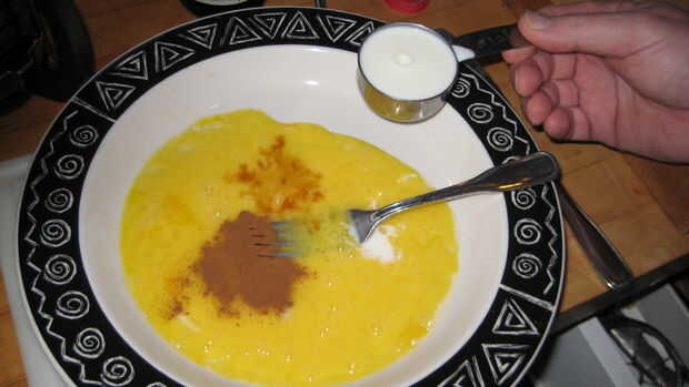 3. pegando... Añadir una cucharadita de extracto de vainilla, una cucharada de canela y 1/4 taza de leche