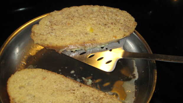 8. una vez notablemente bien cocida por un lado voltee el pan con una espátula