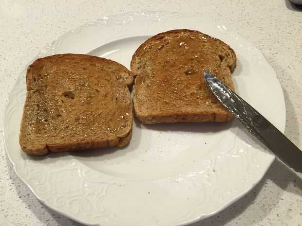 Años hice tostadas en el orden equivocado. ¿Que significan? Con miel líquida, poner encima la mantequilla de maní hace un milagro nivelación o terminas con los dedos de miel. Con miel cruda, poniendo la miel en la parte superior es imposible como mantequilla de maní termina por todas partes. Cuestiones de orden.