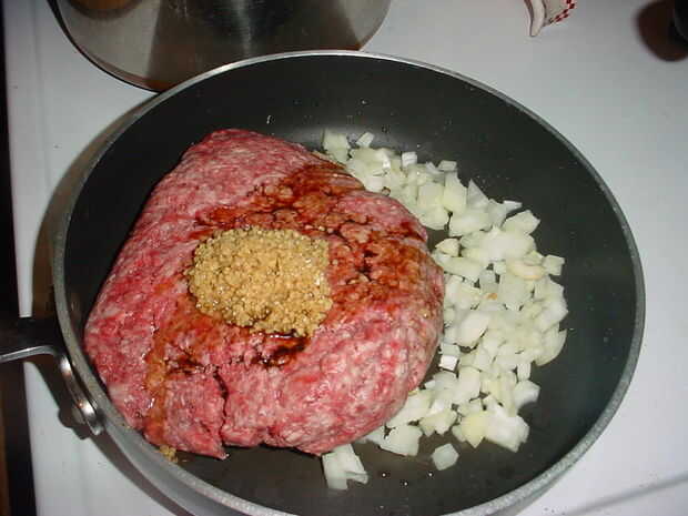 El 1er paso es picar o cortar hasta una cebolla Consíguelo ahora en una sartén y agregar la carne molida de su preferencia, también he añadido algunos worcheshire salsa y ajo