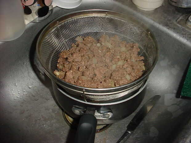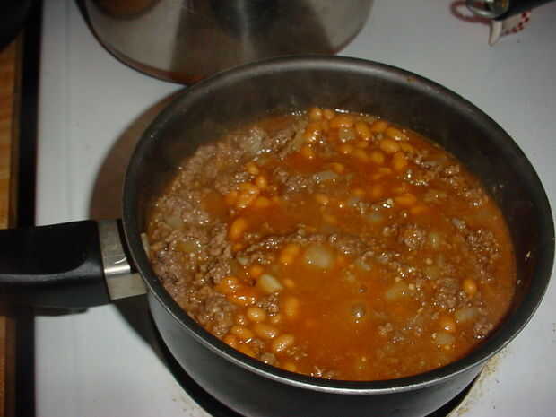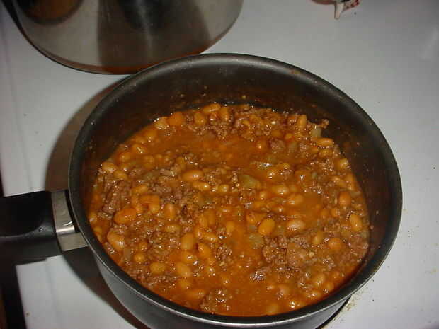 Colar cualquier exceso de grasa o jugos de la carne molida y agregar la carne a los frijoles. ¿Cuánto? Hasta que parece justo a usted pero una libra de carne funciona bien para una gran lata de alubias o una lata de medianas y pequeña, deje que la mezcla hierva a fuego lento hasta que algunos de los jugos son absorbidos en la carne y la mezcla es ligeramente engrosado