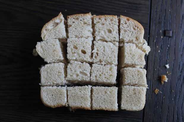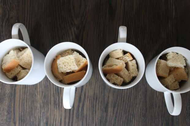 Cortar el pan en cubitos y dividir el lote en cuatro grupos. Poner 1/4 de los cubos de pan en una taza, 1/4 en la segunda taza y así sucesivamente.