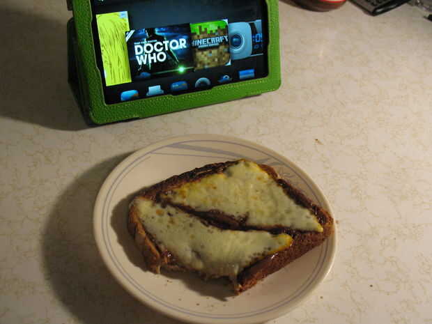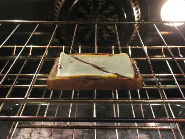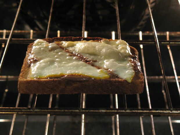 Metes en el horno. Poner la configuración en "Broil". No es necesario poner una placa debajo de él; sin embargo, usted tiene que mantener un ojo en él como asar al horno, muy caliente. No queme! Una vez que el queso es burbujeante y la Nutella es un marrón más oscuro, agarrar un guante y una espátula y colocar en un plato. Proceder a ver