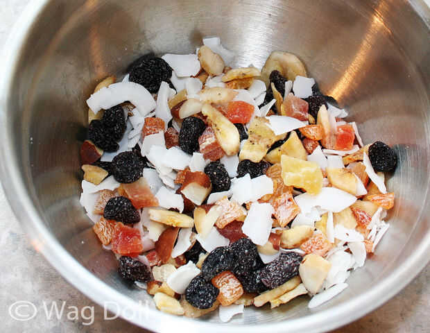 Picar la mezcla de frutos secos si es necesario. He utilizado Trail Mix - una mezcla de orejones y papaya, pasas, chips de plátano y nueces de Brasil