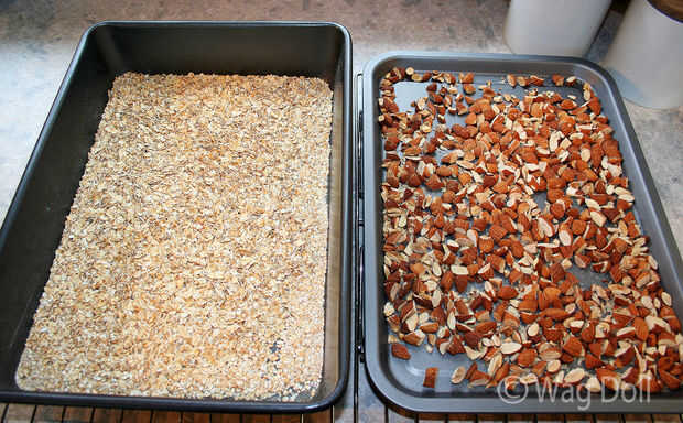 Calentar el horno a una temperatura moderada (160degrees fahrenheit de Celsius/320). Extensión de la avena y las nueces en bandejas para hornear sin engrasar. Extender una capa fina y cocinar en el horno por 30 minutos aproximadamente, revolviendo regularmente. No permita que la avena y tuercas quemar. Cuando la avena y las almendras empiezan a girar oro y olor a nuez magníficamente está listos.