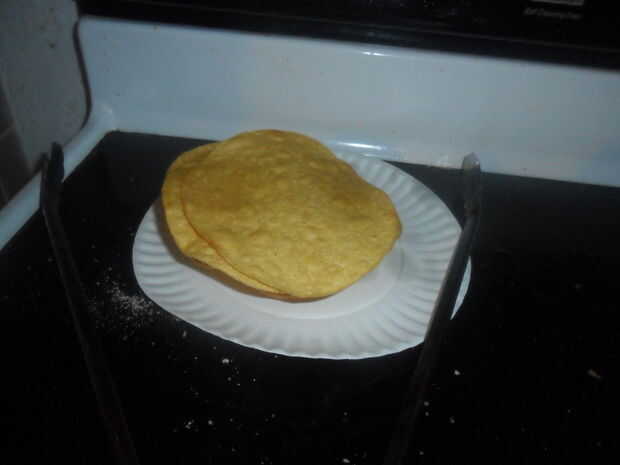 Calentar el aceite en una sartén sobre fuego medio alto. Una tortilla en el aceite de la inmersión, debe chisporroteo. Esperar sobre un minuto y medio y una tapa de tortilla encima, freír por un minuto, escurrir en el plato de papel toalla forrado. Continúe este proceso para el resto de las tortillas.