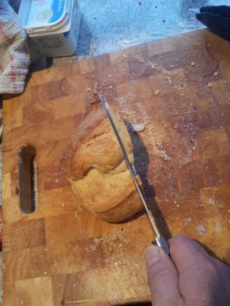 Pulse start girando su emparedado.  Mientras se calienta, cortar el pan en rodajas finas.  Objetivo es conseguir rebanadas 3-4mm de espesor.  Las rebanadas se probablemente se un poco grande para utilizar para salsas, tan cortadas les práctico tamaño galleta.